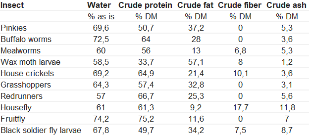 We hebben veel verschillende soorten insecten beschikbaar. Over het algemeen zijn insecten een goede bron van dierlijk eiwit voor uw dieren. Echter bevat niet ieder insect dezelfde voedingswaarde. We hebben een overzicht gemaakte van de macroanalyses van een aantal soorten insecten om deze makkelijk te kunnen vergelijken.
